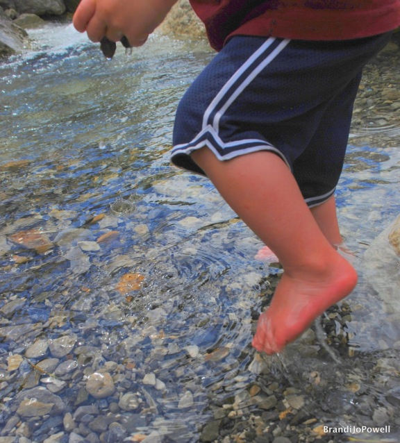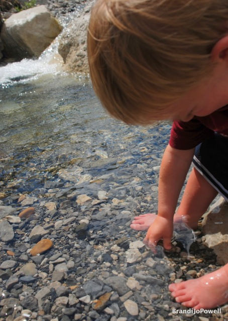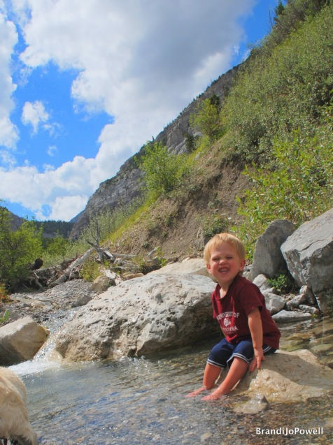 After an hour or so walking through aspen covered trails, wildflower covered hillsides and jumping rocks along the dried up creek bed, we found the stream. Instantly the kids ran to the cold, deep, mountain stream pool and nearly collapsed into it’s cool, regenerating water. Even Landon was trying to wiggle free from the safe hold of the pack on my back. Once released he kicked off his shoes and waddled into the cool waters.