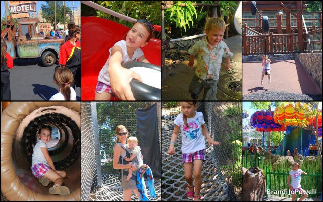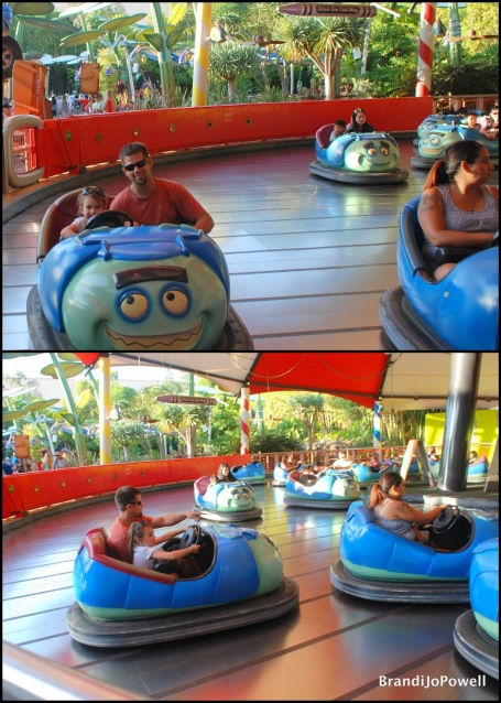 Speaking of bug’s world. We went into the buggy world totally not expecting a sit-down theater show. We followed the crowd and entered. We were each given 3D glasses and we had a seat, totally naive to what was about to happen to us! The theater got pitch dark, Addi was instantly on my lap. Landon was still asleep in Daddy’s lap. Then Flikk was there in 3D, telling us he was going to introduce us to the world of bugs. Before we knew it, bugs were flying from the screen right into our faces, we were being sprayed with bug acid, giant spiders fell practically into our lap from the ceiling, we were blasted with a strong wind of stinky bug air, butterflies fluttered around us — oh and I forgot to mention, at the first sight of bugs Addi was quivering huddled in terror behind me — it was animated, and in 3D but so, so real and very, very cool. In all the buggy commotion Landon woke up and was totally loving it. In the darkness I heard him, ooohhh and awwwwing. Addi hated it. She had developed a hatred and fear of all bugs and it’s safe to say she may never outgrow it after this! Before we got up to leave Flikk told us to please remain seated to let the spiders and beetles leave first and then under our chairs we literally felt them leaving. Our chairs rumbled to life and it felt like large bugs were moving underneath us! It was awesome! We tried talking Addi into going back and she would not have it!