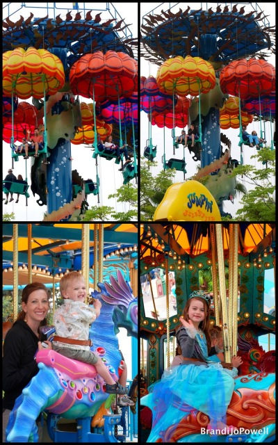 I was able to talk Addi into riding on the jellyfish ride with me only after she watched me go on it first. Then she wanted to keep going over and over again! We rode the Ariel carousel and ran into our favorite pant-less duck, Donald.