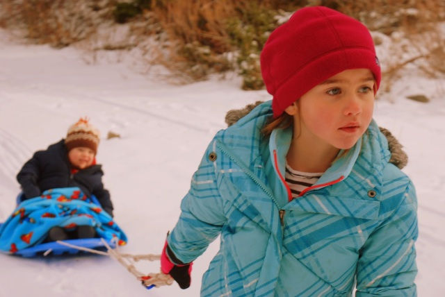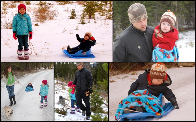 Addison pulled Landon in the sled for the first time. He was having a great time dragging his glove alongside the sled and then eating the snow off his glove. It was such a little kid thing to do. It made us laugh! His nose would wrinkle and he would giggle when Addi pulled a little bit faster. I think he liked it.