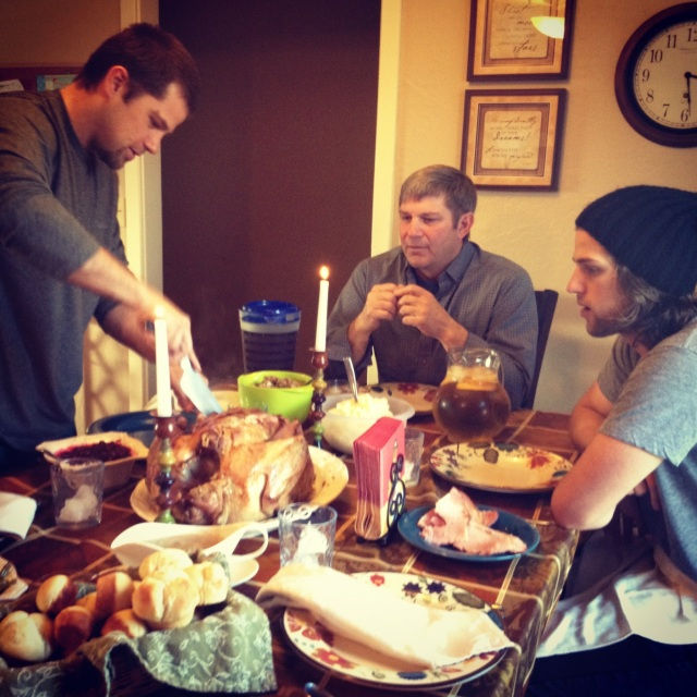 Daddy carved the upside turkey (whoops, my bad!!) at the table.