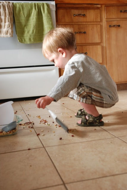Even after having a blast making a huge mess with his uncooked beans, he promptly cleans them up.