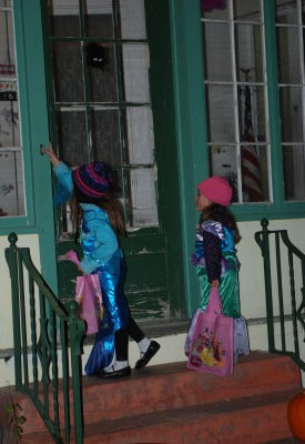 Trick-or-treating was a blast. The girls walked to a couple of our neighbor’s houses all by themselves. They were so proud skipping along holding hands. After dinner we went all went trick-or-treating. An old lady gave the girls a package of Top Ramen. Instantly Addi ran to Papa, slammed the ramen against his chest and said, “Papa’s favorite soup!” Ellie eventually forgave me for running behind a dark bush and scarring her and Addi just as they got up their brave to walk along the spooky, dark path. With a big hug, I apologized and she said, “I forgive you Auntie. It was just a trick.” Uncle Dylan tracked down the special house that was rumored to hand out cotton candy. It was the last house, the icing on the cake. Instead of saying trick-or-treat, with great excitement Ellie yelled to the man, “cotton candy!” The girls had a blast and quickly filled their candy bags. They literally ran to each house careful not to trip on their mermaid tails. Ellie, being less reluctant than Addi, rang the doorbells and pounded on the door until someone answered. She yelled, “Hello. Is anybody home?” She wasn’t leaving until someone gave her some candy! At one house where no one answered Addi snuck behind Ellie and dropped some candy on the stair and said, “Look Ellie, there is some candy for you. “ She is always looking after her best little cousin.